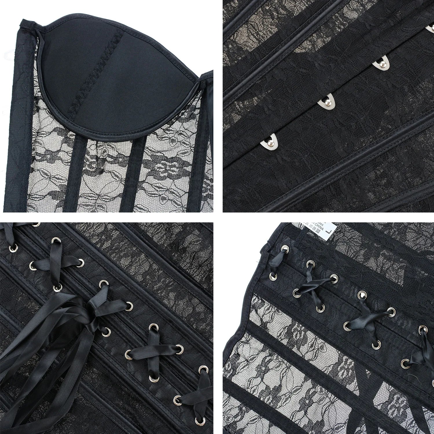 Women's Steel Boned Corset With Front Buttons And Back Lacing Lace Mesh Strapless Top Sexy Gothic Fashion Club Wear