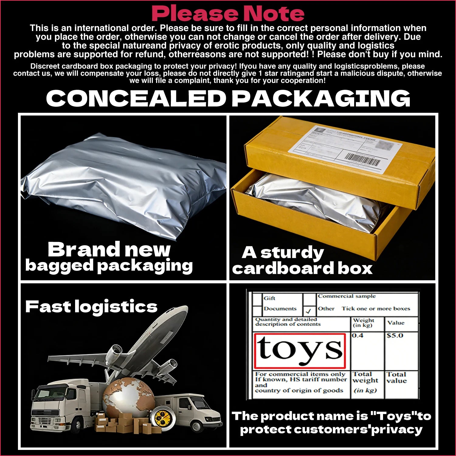 4.We will ship the dildo with Sturdy carton, no people knows what's in it, we will declare it as toys for custom, your personal privacy will be well protected.