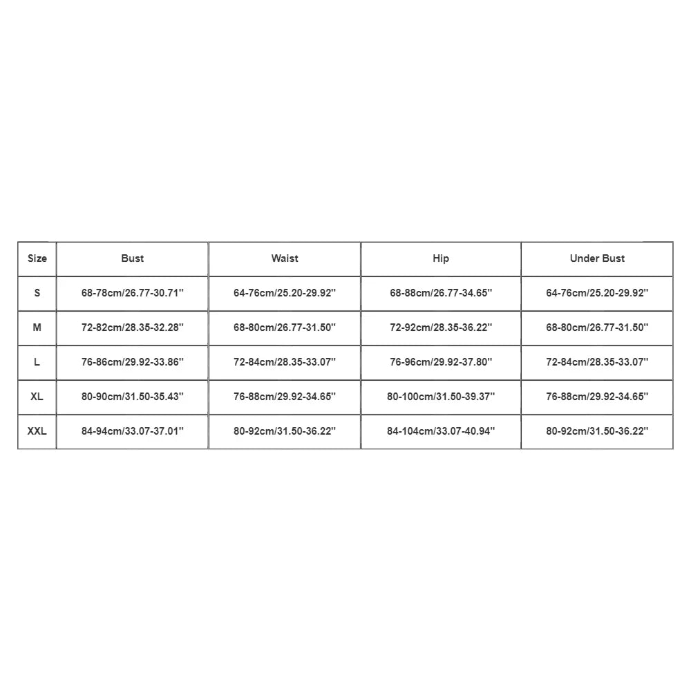 | Size:XXL | Bust:84-94cm/33.07-37.01'' | Waist:80-92cm/31.50-36.22'' | Hip:84-104cm/33.07-40.94'' | Under Bust:80-92cm/31.50-36.22'' |