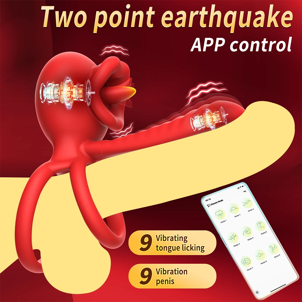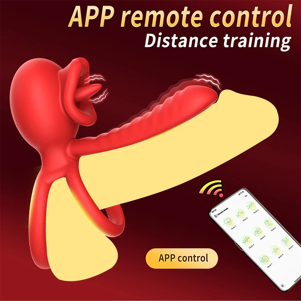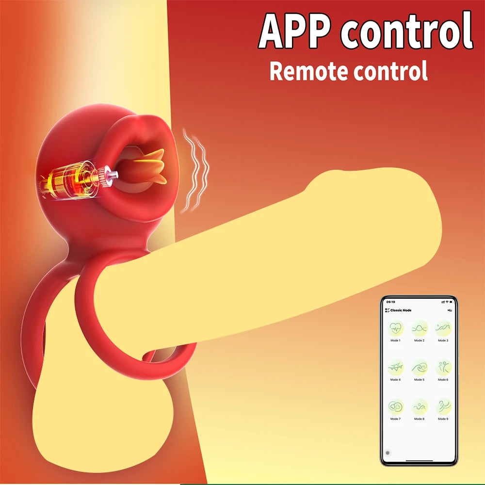 App Vibrating Penis Ring Vibrator with Sexy Licking Mouth G Spot Clitoral Stimulator Cock Rings Couples Adult Sex Toys for Men