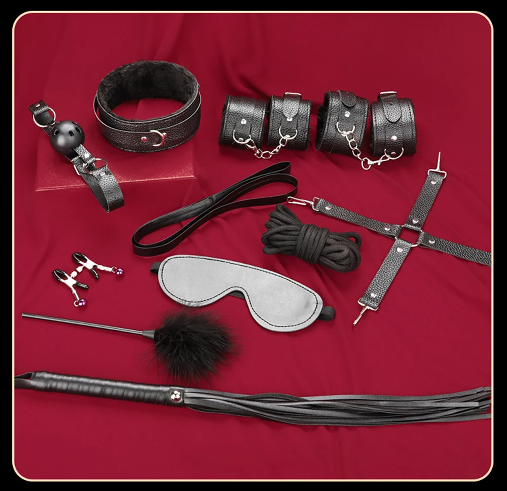 BDSM Bondage Restraint Kit 10 Pieces Drawstrings Collars Eye Masks Mouth Balls Whips Cotton Ropes Nipple Clamps Rope for Couple