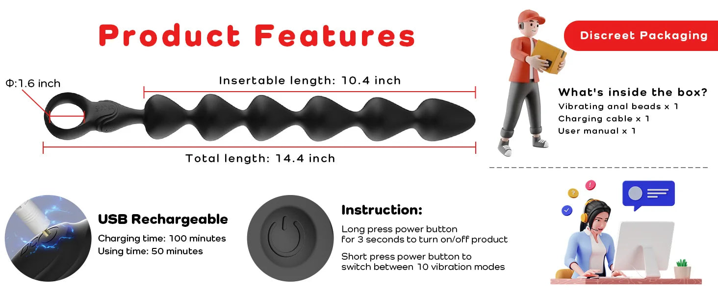 【10 Vibration Modes & 3 Motors & 14.4 Inch】With a total length of 14.4 inch, this prostate massager anal beads is definitely the anal sex toy you've been dreaming of. This anal toy vibrates with 10 vibration patterns and 3 motors, creating a buzz that can reverberate all through the pelvis when they're inserted. The first and ever 3 motors design makes the whole string vibrates in every corner while working, It can really fill you up and bring you more of a full sensation than anal plug.