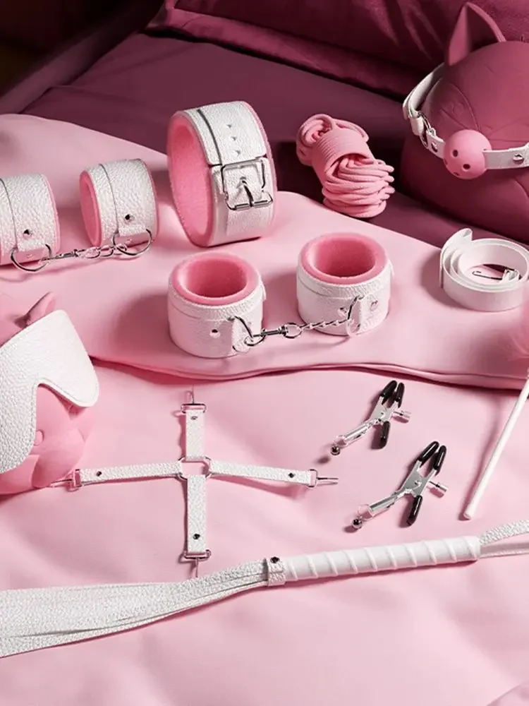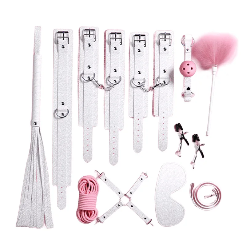 Packing list: handcuffs, ankle cuffs, drawstring, collar, eye mask, mouth ball, leather whip, 10 meter rope, breast clip, feather stick, cross buckle