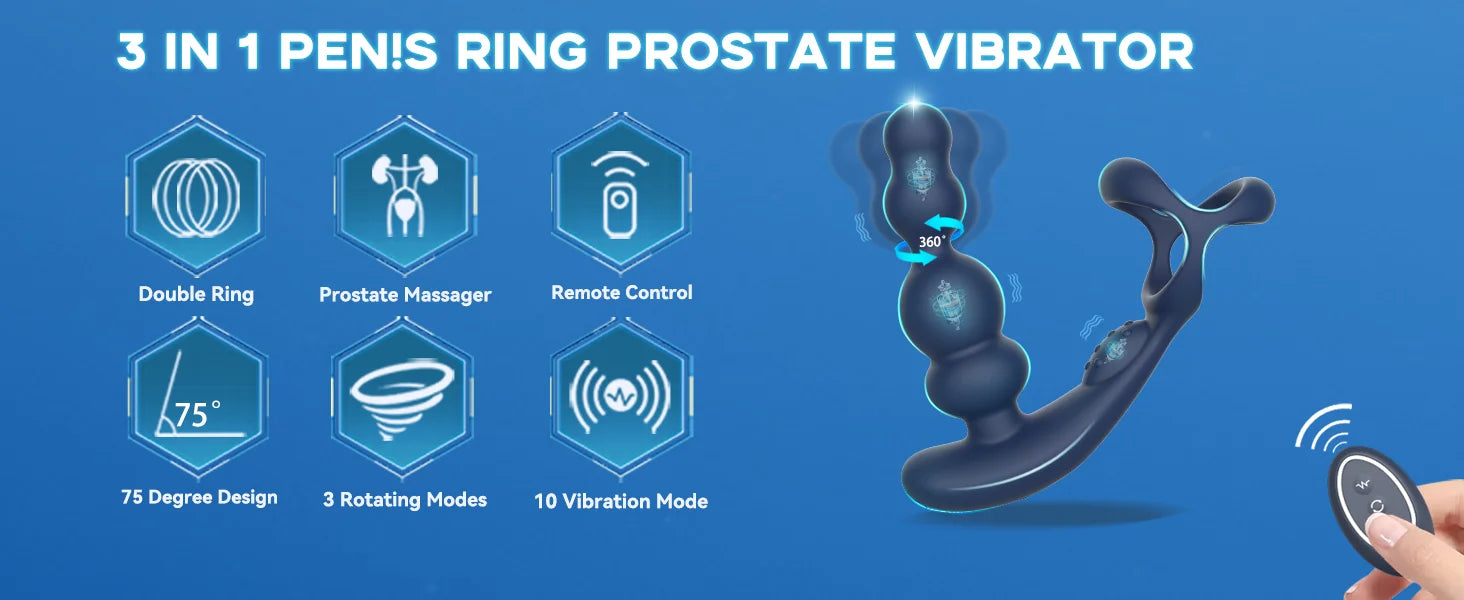 Male Prostate Massager 360° Rotation Anal Vibrator with Penis Ring Butt Plug Remote Control Wearable Anus Sex Toy for Men Gay