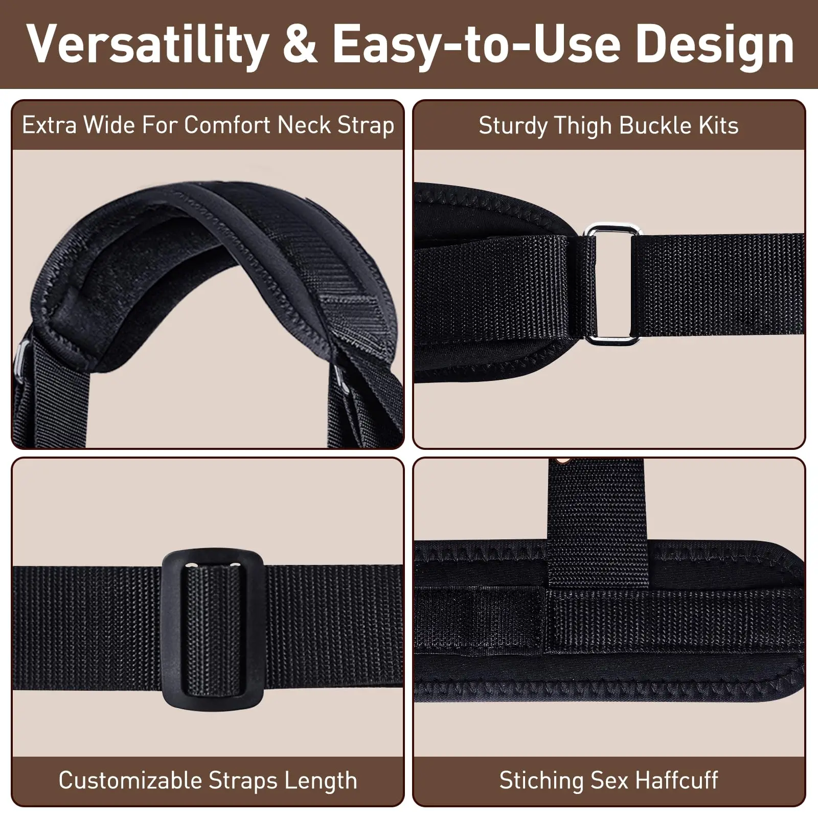 Customizable Length - The bondage kits both sides adjust so that you can find exactly the angle that gives you the best view and penetration. The neck support even allows your lover a more comfortable view as they watch all the action! Handcuffs on either side of the neck area easily transform your sexual experience into a scene of bondage and power-play. Explore the greater depths of your lover and ecstasy!